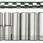 Set of 8 deep 1/2" drive 12 point metric sockets supplied on a clip rail. Made from chrome vanadium steel with a satin finish.