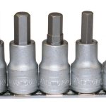 Set of 9 1/2" drive metric hex bit sockets for internal hex holes supplied on a clip rail with a satin finish.