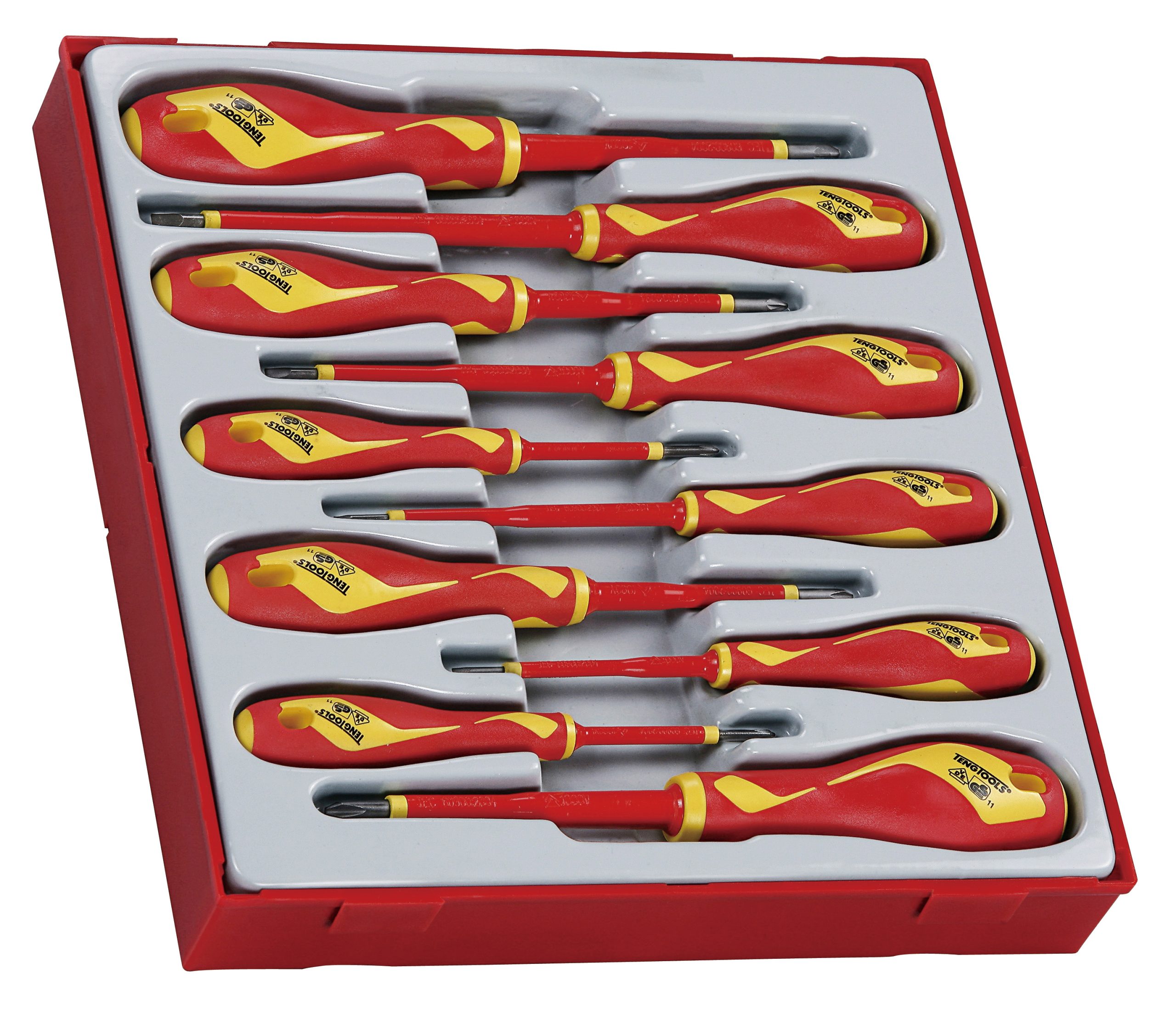 Set of 10 1,000 volt insulated screwdrivers including flat as well as PH and PZ types. Features include TT-MV PLUS steel blades and ergonomically designed bi-material handles with hanging hole and T drive facility for added torque and comfort. All produced and tested according to the EN60900 standard. Approved for working up to 1,000 volt AC. The set is supplied in a unique Teng Tools TC tray and can be used either on it's own or as part of the Teng Tools TC control system. The tray features a removable hinged click lock lid and dove tail joints which enable different TC trays to be locked together and used as trays in Teng Tools tool boxes and roller cabinets. All of the tools in the set have their own individual place so lost tools can easily be identified. (265x284x50mm, 1.2 kilos).