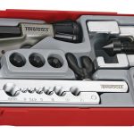 A comprehensive tube flaring kit which is suitable for copper, brass and thin walled aluminium tubing. 45ß tube press flare pipes from 3/16” to 5/8” diameter. The pipe cutter can cut up to 30mm diameter. Features include a spare cutting wheel inside the handle. The set is supplied in a unique Teng Tools TC tray and can be used either on it's own or as part of the Teng Tools TC control system. The tray features a removable hinged click lock lid and dove tail joints which enable different TC trays to be locked together and used as trays in Teng Tools tool boxes and roller cabinets. All of the tools in the set have their own individual place so lost tools can easily be identified. (265x142x50mm, 1.7 kilos).