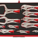 11 piece set containing assorted power grip pliers. The set comes supplied in a two colour EVA block which has been computer milled to house each specific tool. The top layer of the block is black and the bottom layer is red so that as soon as a tool is taken out, the shape of the tool is clearly visible. The EVA block is also etched with the size or description of the tool next to it's position so that if a tool is missing not only can the space be clearly seen but the missing tool can be identified quickly. (570x375x75mm, 5.17 kilos).