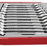 12 piece metric combination spanner set featuring a typically Teng new design in combination spanners that provides an anti slip on the open end and a hip grip function where the spanner drives on the flank of the fastening rather than the corner. The design also provides grip on fastenings with worn or rounded corners. The combination of these features allow for a much better grip with less risk of damage to fastenings. The set is supplied in a unique Teng Tools TC tray and can be used either on it's own or as part of the Teng Tools TC control system. The tray features a removable hinged click lock lid and dove tail joints which enable different TC trays to be locked together and used as trays in Teng Tools tool boxes and roller cabinets. The tools are held in place using the Teng Tools two colour pre-cut EVA foam which has been computer milled to house each specific tool. The top layer of the foam is black and the bottom layer is red so that as soon as a tool is taken out, the shape of the tool is clearly visible. The EVA foam is also etched with the size or description of the tool next to it's position so that if a tool is missing not only can the space be clearly seen but the missing tool can be identified quickly. (265x284x50mm).