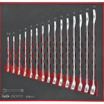 15 piece metric combination spanner set covering 5.5 to 19mm. The spanners feature a 12 point ring end which is set at a 15° angle, same dimensions at both ends and are made from chrome vanadium with a satin finish. The set is supplied in a unique Teng Tools TC tray and can be used either on it's own or as part of the Teng Tools TC control system. The tray features a removable hinged click lock lid and dove tail joints which enable different TC trays to be locked together and used as trays in Teng Tools tool boxes and roller cabinets. The tools are held in place using the Teng Tools two colour pre-cut EVA foam which has been computer milled to house each specific tool. The top layer of the foam is black and the bottom layer is red so that as soon as a tool is taken out, the shape of the tool is clearly visible. The EVA foam is also etched with the size or description of the tool next to it's position so that if a tool is missing not only can the space be clearly seen but the missing tool can be identified quickly. (265x284x50mm).