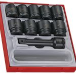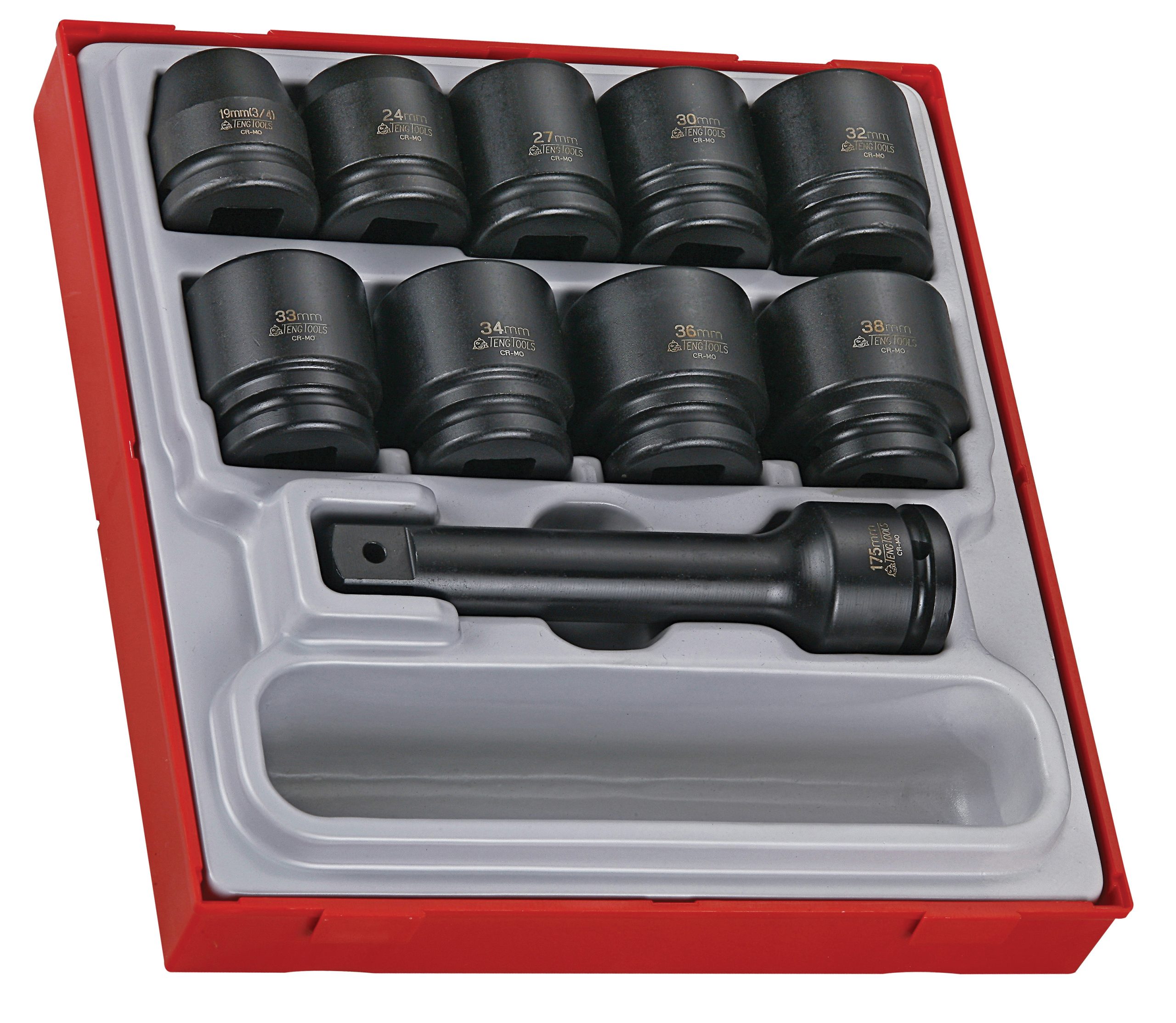 3/4” drive impact socket set containing regular sockets 19 to 38mm, plus accessories including an extension bar and retaining rings and pins. The set is supplied in a unique Teng Tools TC tray and can be used either on it's own or as part of the Teng Tools TC control system. The tray features a removable hinged click lock lid and dove tail joints which enable different TC trays to be locked together and used as trays in Teng Tools tool boxes and roller cabinets. All of the tools in the set have their own individual place so lost tools can easily be identified. (265x284x50mm, 5.6kilos).