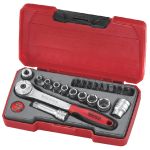 22 piece 1/4" drive socket set containing 6 point sockets, 60 teeth ratchet handle, 2" extension bar, bits holder, 10 bits and hanging hook. The set comes supplied in a plastic case with a snap lock and hinges with metal pins for extended life. (170x90x35mm, 0.45 kilos).