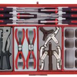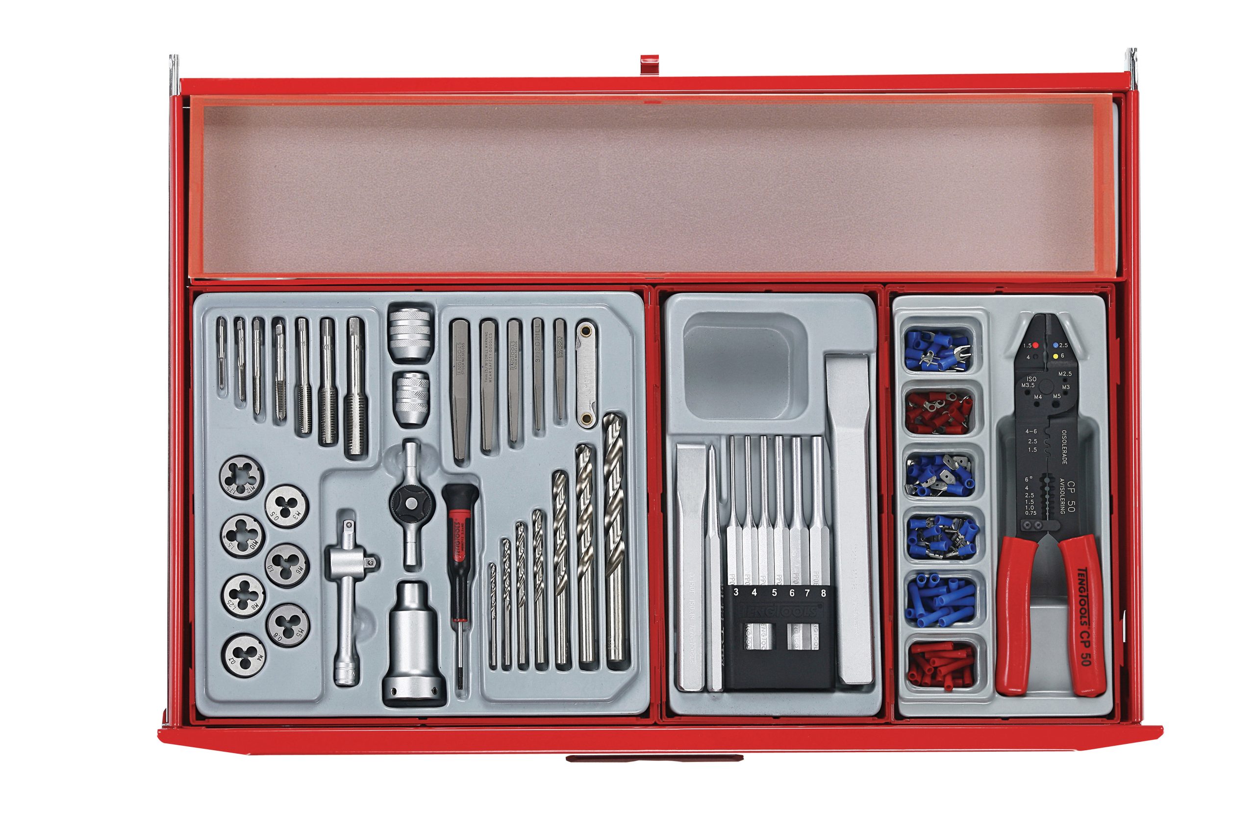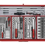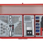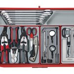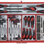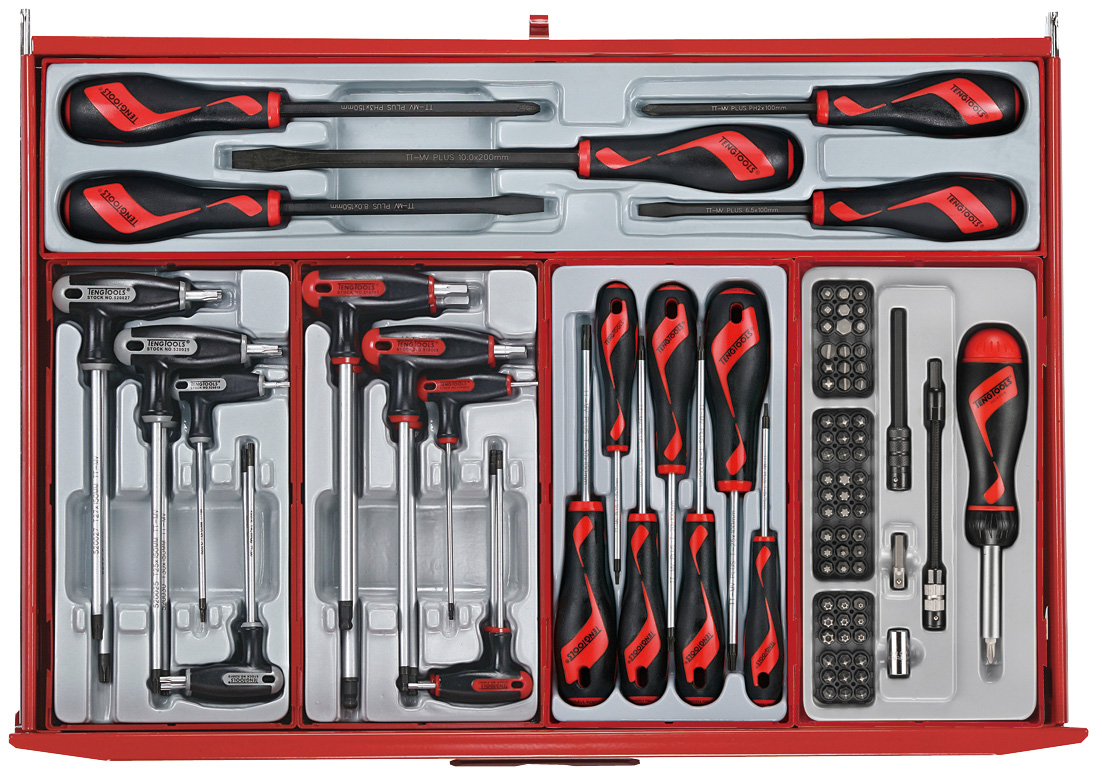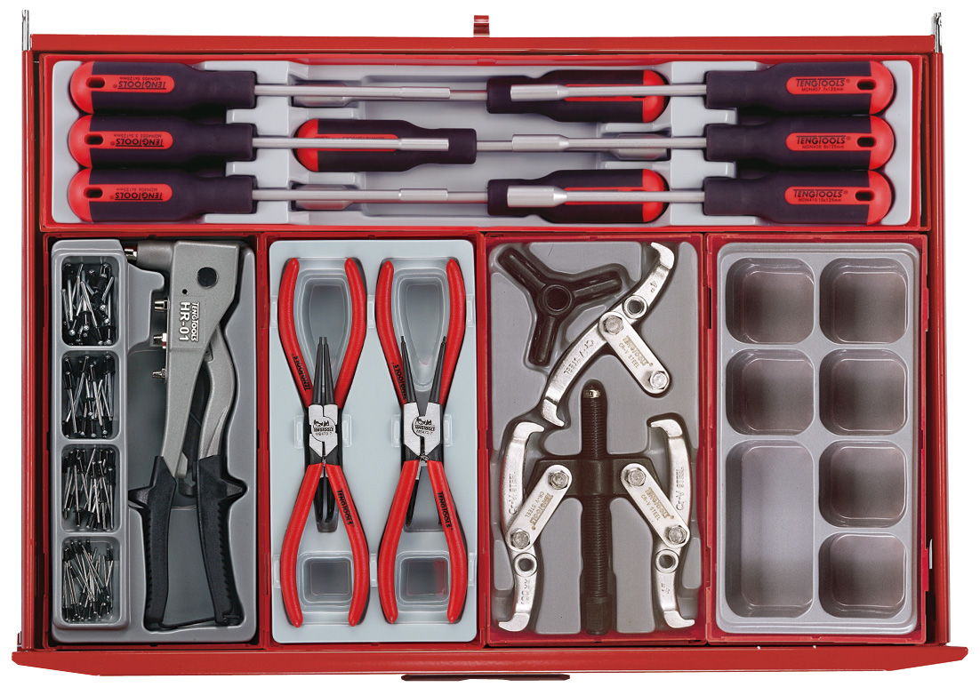 A 545 piece work station tool kit built up using the unique Teng Tools TC tray system and the Teng Tools wall rack system to put the most frequently used tools near to hand and ready to use. The kit is supplied in the 8 series ball bearing slide 7 drawer roller cabinet together with the TC-S01 panel set with 20 assorted hooks (TCW-HK20).