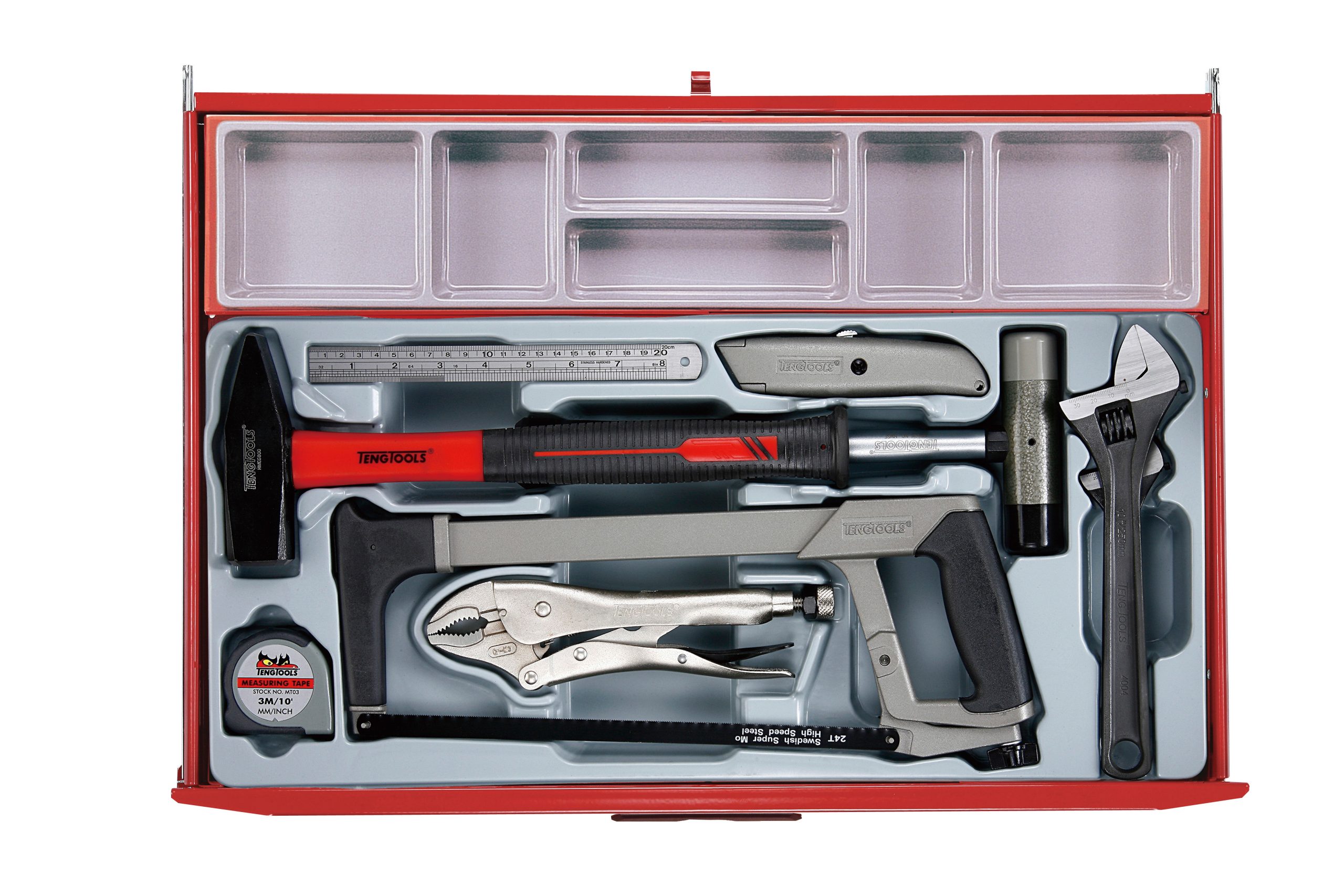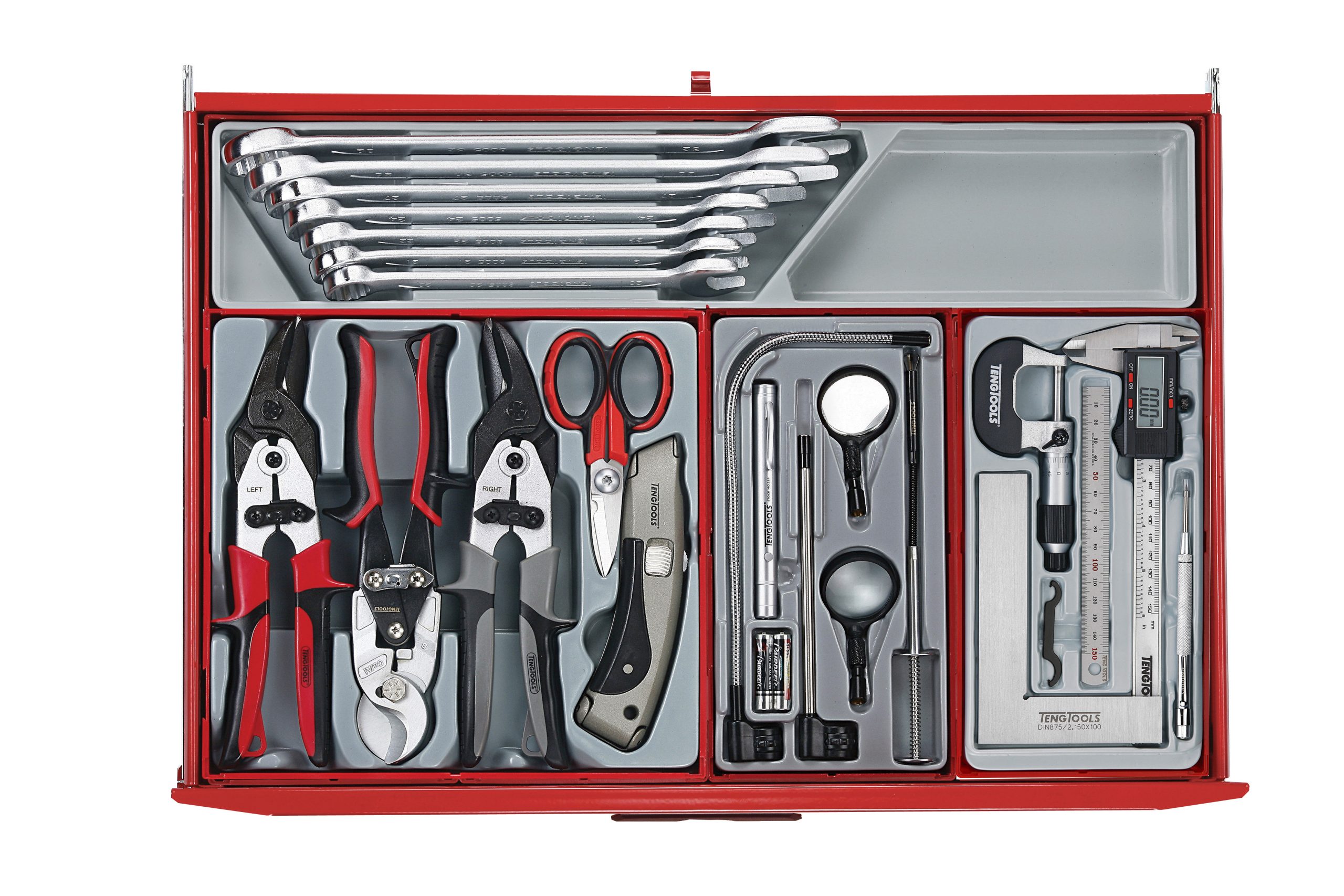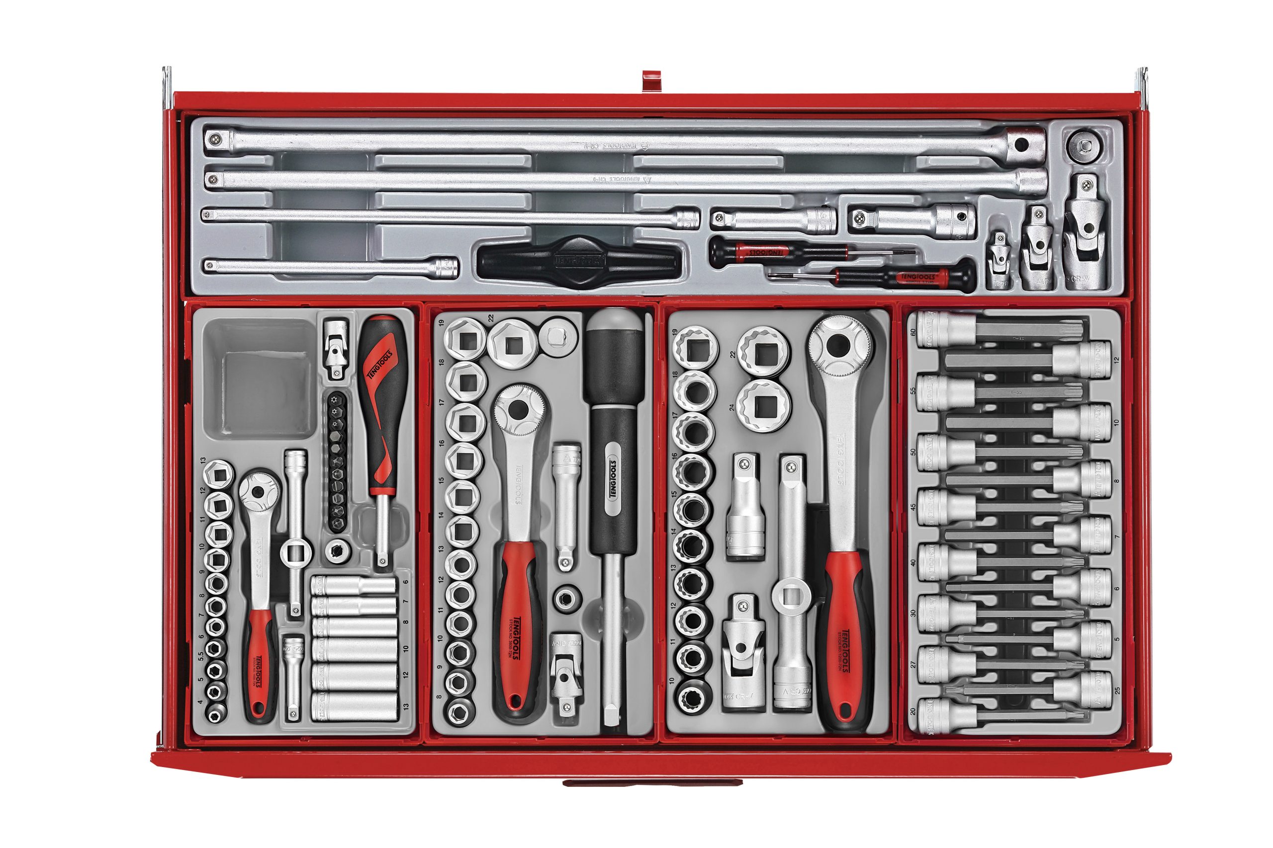 A 545 piece work station tool kit built up using the unique Teng Tools TC tray system and the Teng Tools wall rack system to put the most frequently used tools near to hand and ready to use. The kit is supplied in the 8 series ball bearing slide 7 drawer roller cabinet together with the TC-S01 panel set with 20 assorted hooks (TCW-HK20).
