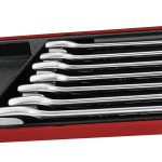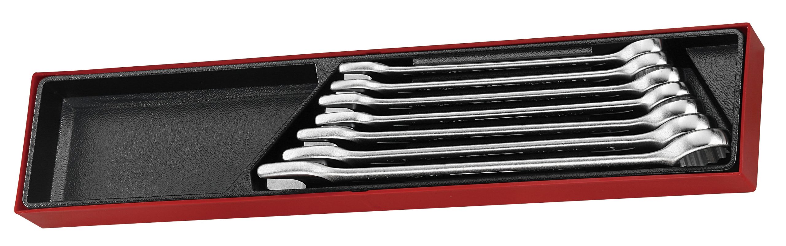 7 piece 12 point AF combination spanner set ranging from 13/16” to 1 1/4”. Made from chrome vanadium steel with a satin finish. The 12 point ring head is angled at a 15° angle. The set is supplied in a unique Teng Tools drawer width TTX tray and can be used either on it's own or as part of the Teng Tools TC control system. The tray features a removable hinged click lock lid and dove tail joints which enable different trays to be locked together and used as trays in Teng Tools tool boxes and roller cabinets. All of the tools in the set have their own individual place so lost tools can easily be identified. (560x110x72mm, 2.6 kilos).