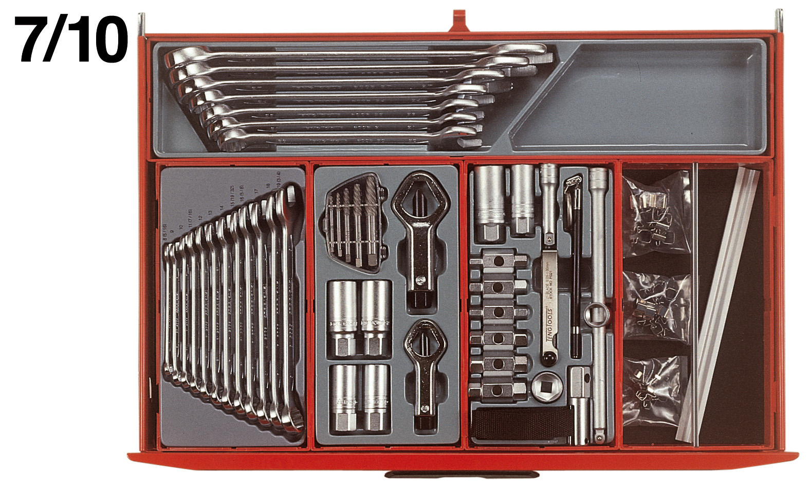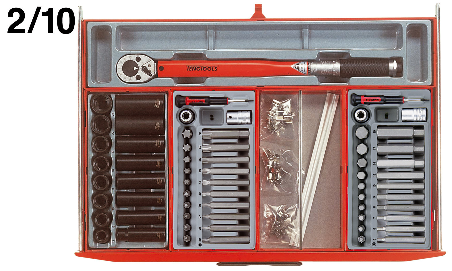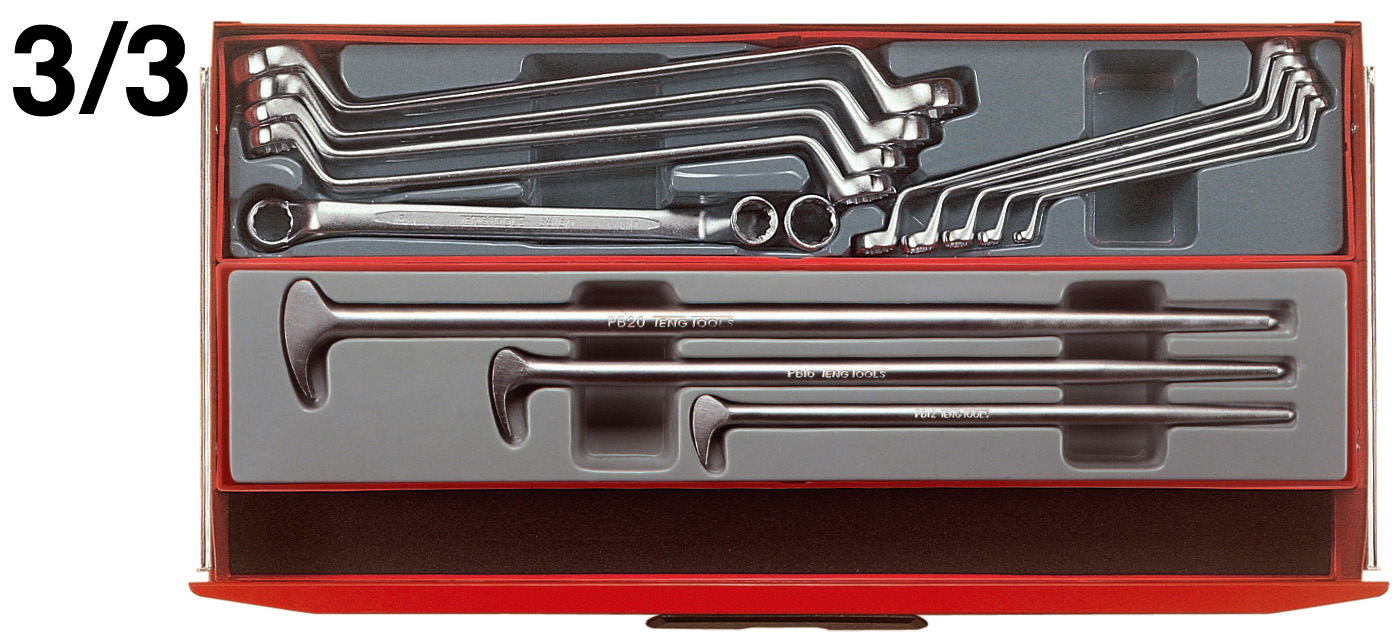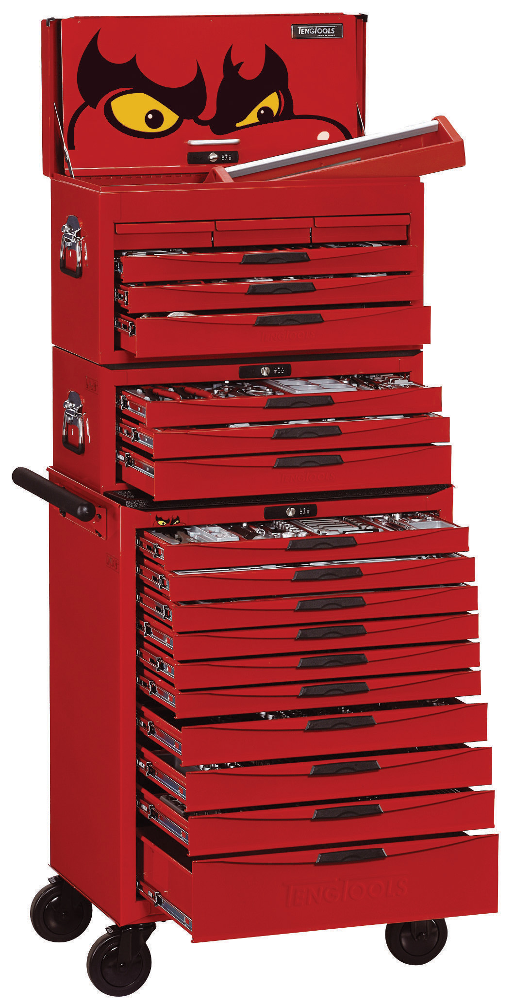 A 715 piece tool kit completely built up using the unique Teng Tools TC tray system and covering just about every tool people will ever need. Supplied in an 8 series ball bearing slide top box/middle box/roller cabinet combination. Brackets to connect the middle box to the roller cabinet are included.