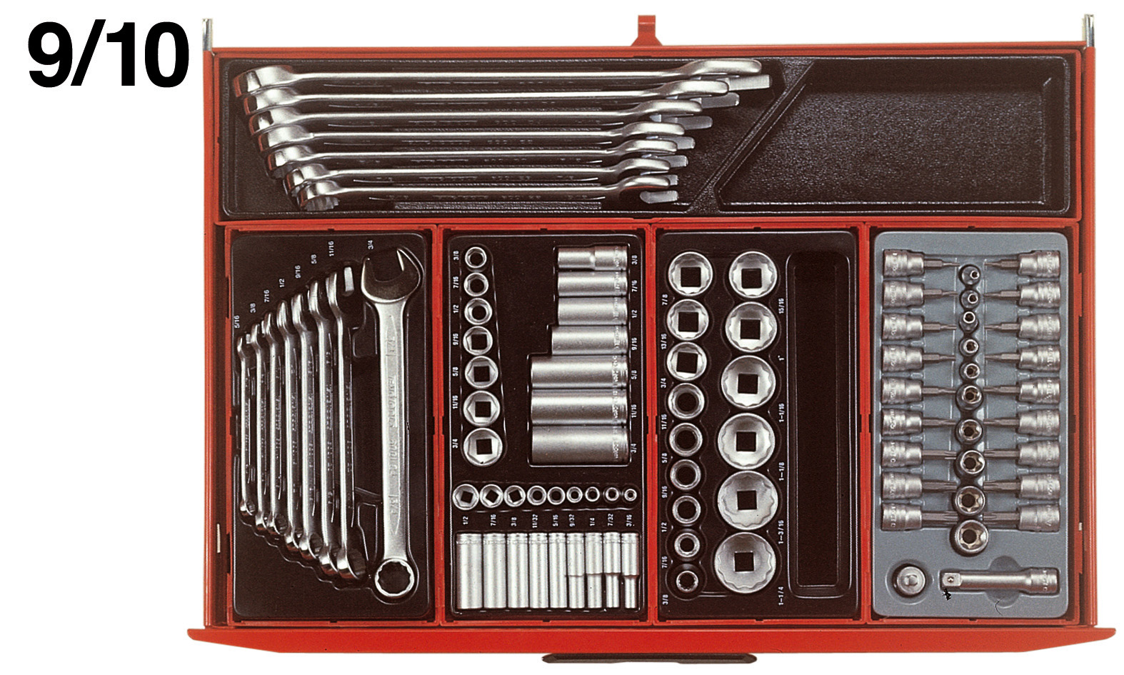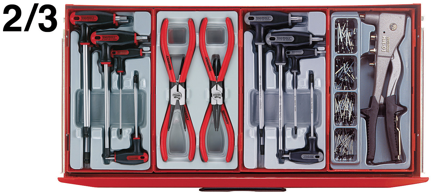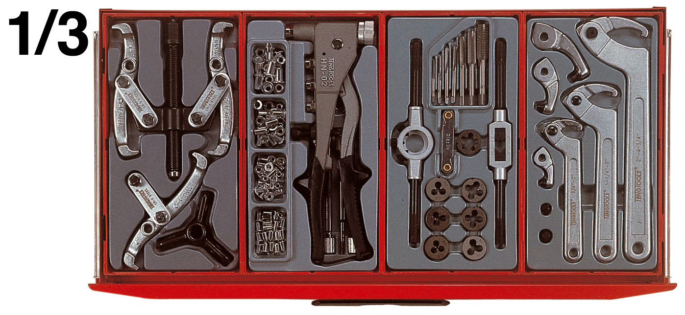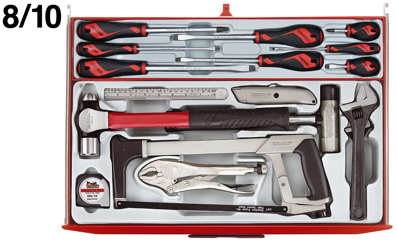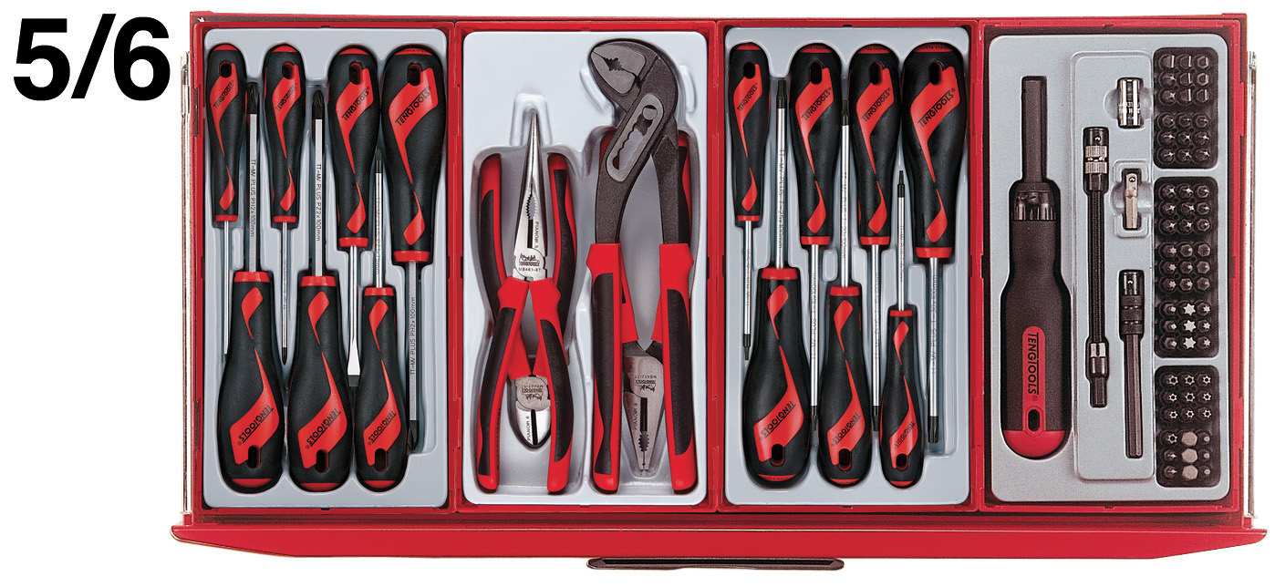 A 715 piece tool kit completely built up using the unique Teng Tools TC tray system and covering just about every tool people will ever need. Supplied in an 8 series ball bearing slide top box/middle box/roller cabinet combination. Brackets to connect the middle box to the roller cabinet are included.