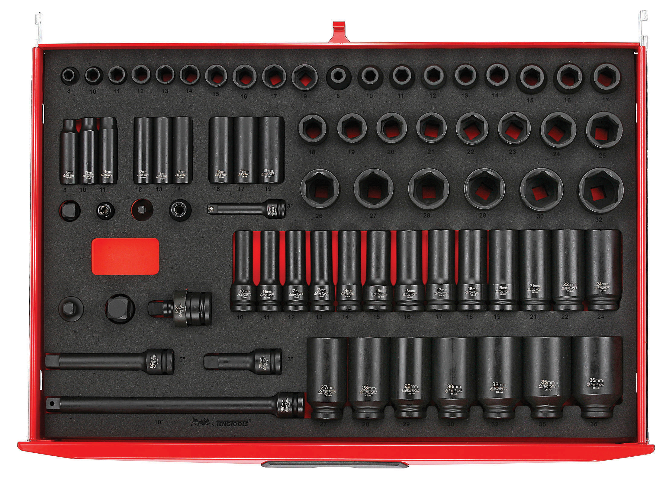 • Deep impact sockets: 1/2" drive; 6 point; 10, 11, 12, 13, 14, 15, 16, 17, 18, 19, 21, 22, 24, 27, 28, 29, 30, 32, 35, 36mm