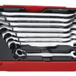8 piece ratcheting AF combination spanner set with the same size at both ends. Combined ring/open ended spanners with a 12 point ring. The ratchets are flip reverse and offset by 13° for use on flat surfaces. Made from chrome vanadium with a satin finish. The set is supplied in a unique Teng Tools TC tray and can be used either on it's own or as part of the Teng Tools TC control system. The tray features a removable hinged click lock lid and dove tail joints which enable different TC trays to be locked together and used as trays in Teng Tools tool boxes and roller cabinets. All of the tools in the set have their own individual place so lost tools can easily be identified. (265x142x50mm, 1.18 kilos).