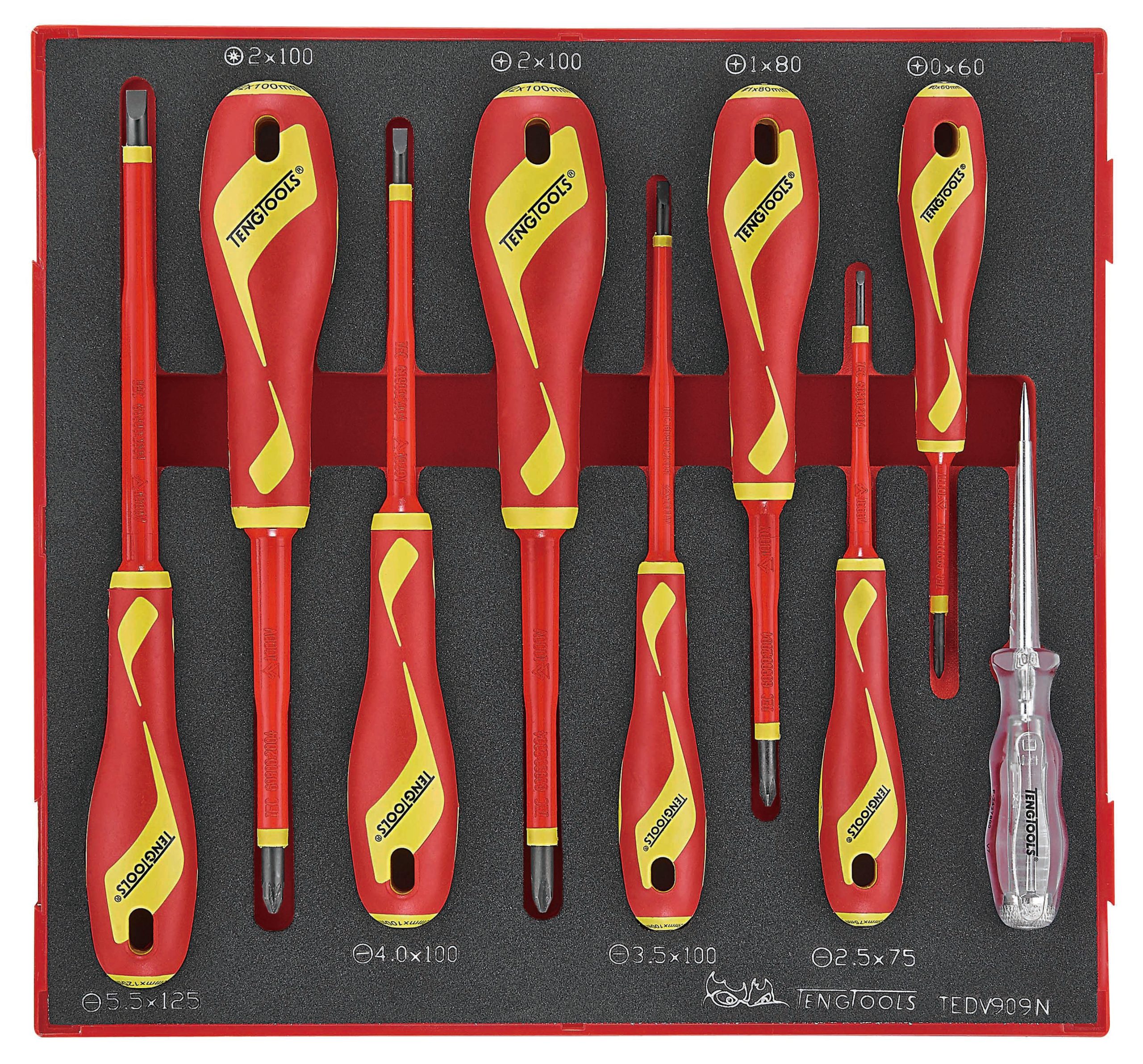 9 piece 1,000 volt insulated screwdriver set. The set is supplied in a unique Teng Tools TC tray and can be used either on it's own or as part of the Teng Tools TC control system. The tray features a removable hinged click lock lid and dove tail joints which enable different TC trays to be locked together and used as trays in Teng Tools tool boxes and roller cabinets. The tools are held in place using the Teng Tools two colour pre-cut EVA foam which has been computer milled to house each specific tool. The top layer of the foam is black and the bottom layer is red so that as soon as a tool is taken out, the shape of the tool is clearly visible. The EVA foam is also etched with the size or description of the tool next to it's position so that if a tool is missing not only can the space be clearly seen but the missing tool can be identified quickly. (265x284x50mm).